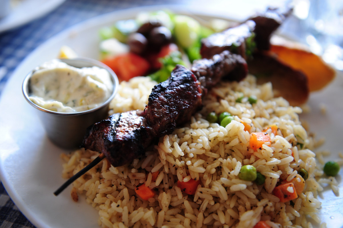 ビーフのSouvlaki(小)。付け合わせのピラフ、ポテト、greek saladどれも美味しそう~
